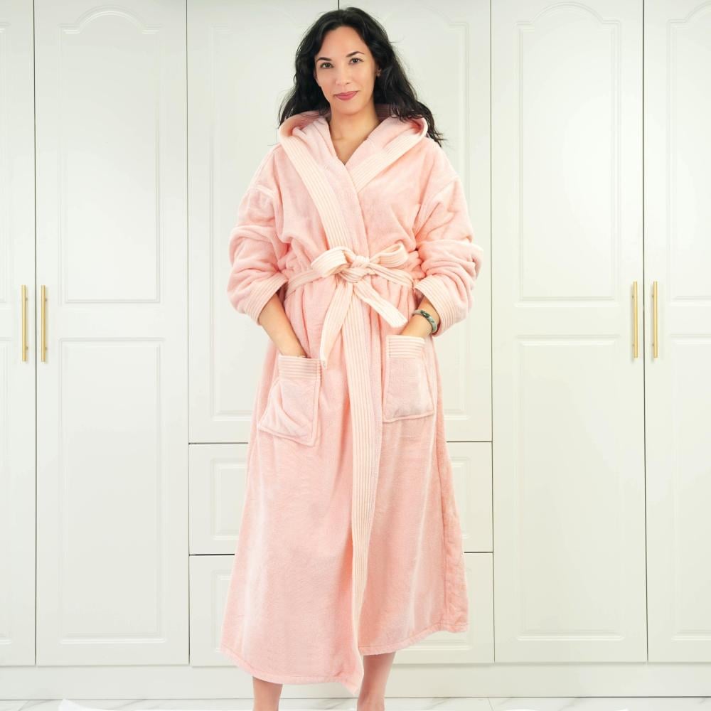 ابدئي لحظات الاسترخاء بإحساس من الدفء والرقة مع روب بلوجرين الوردي الفاتح. بتصميمه الطويل والمريح وقبعته الناعمة، يلفّك بلمسة حنونة ويمنحك راحة فاخرة بعد كل حمّام أو خلال أوقات الاسترخاء في المنزل.